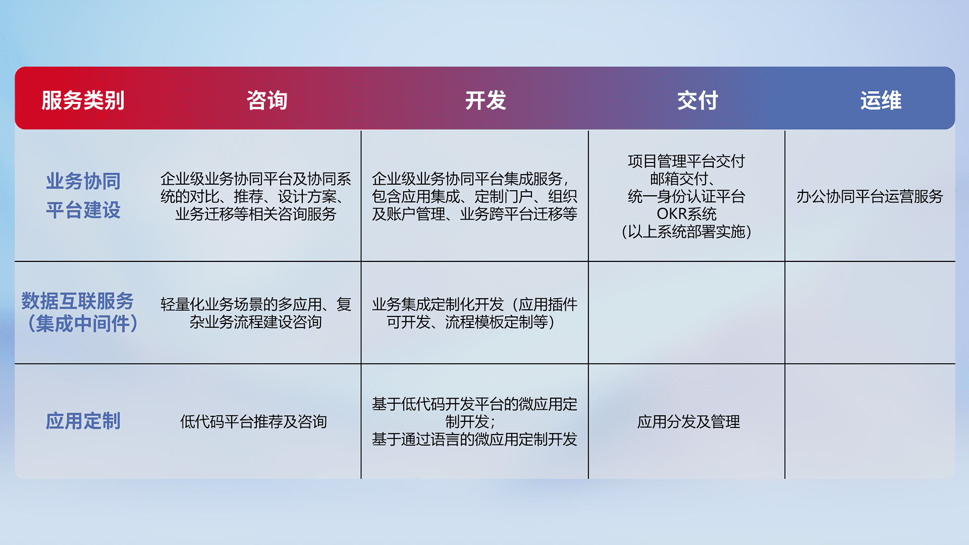 针对钉钉、、、、企微、、、、IDaas等平台级产品提供产品的规划、、、、方案、、交付、、、、定制化开发等服务,,,,实现如统一协同办公、、智能客户服务、、、混合会议管理、、、、智能数据查询、、、、等业务场景,,,,实现数字化转型。。。。